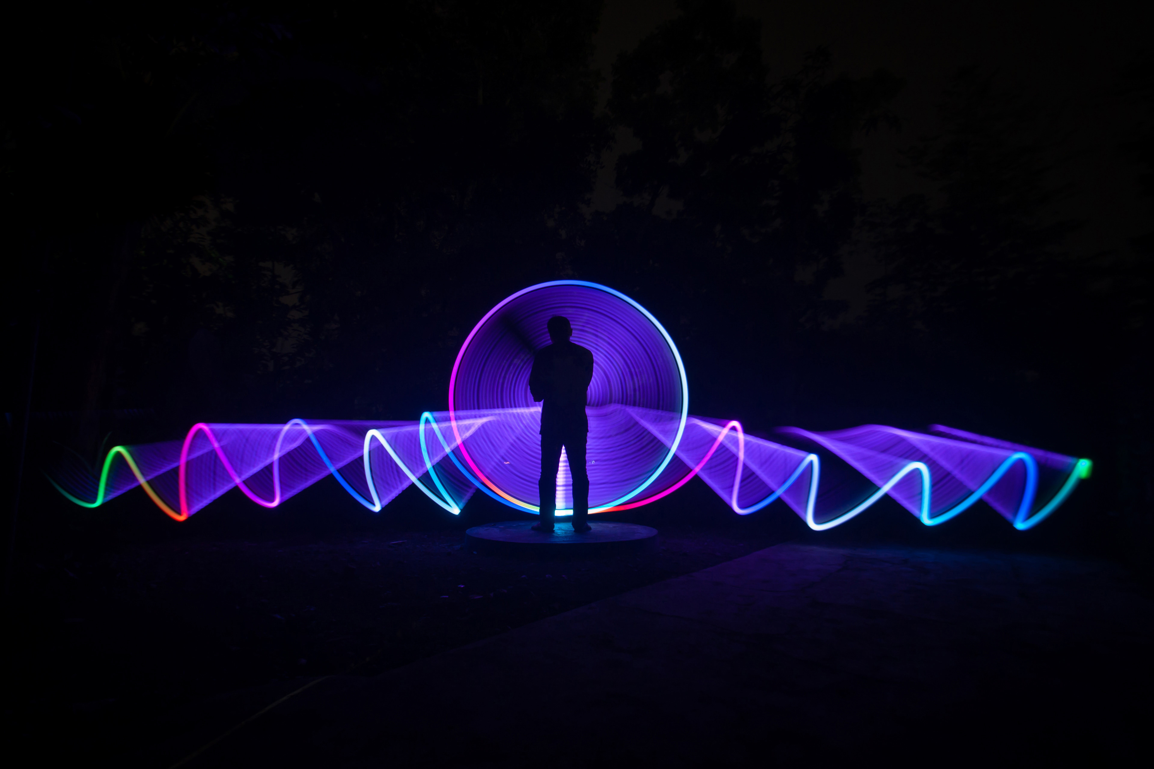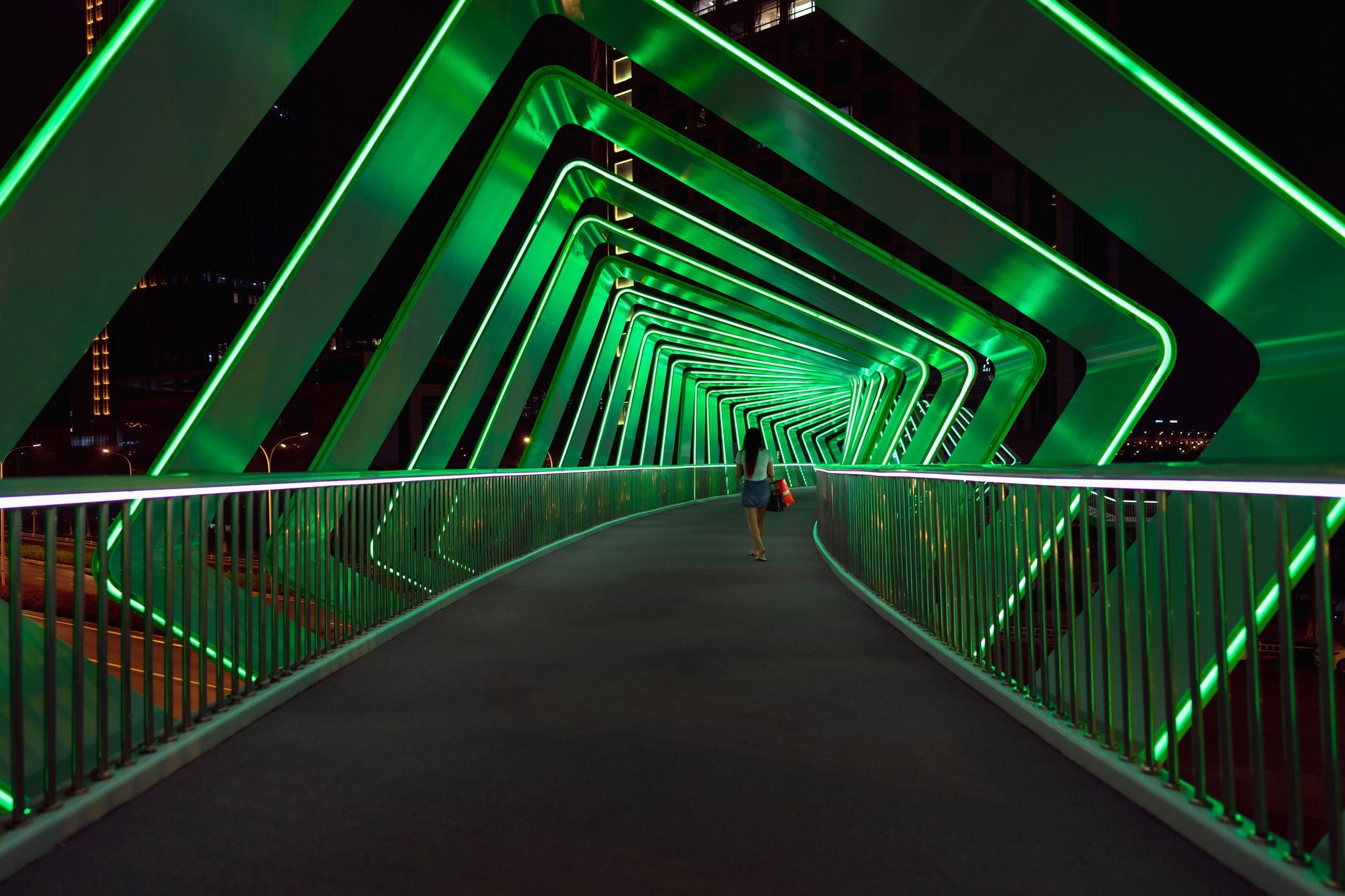 Night scene of neon lights on the pedestrian bridge of Chuanggu Road, Tong'an District, Xiamen City, Fujian Province, China