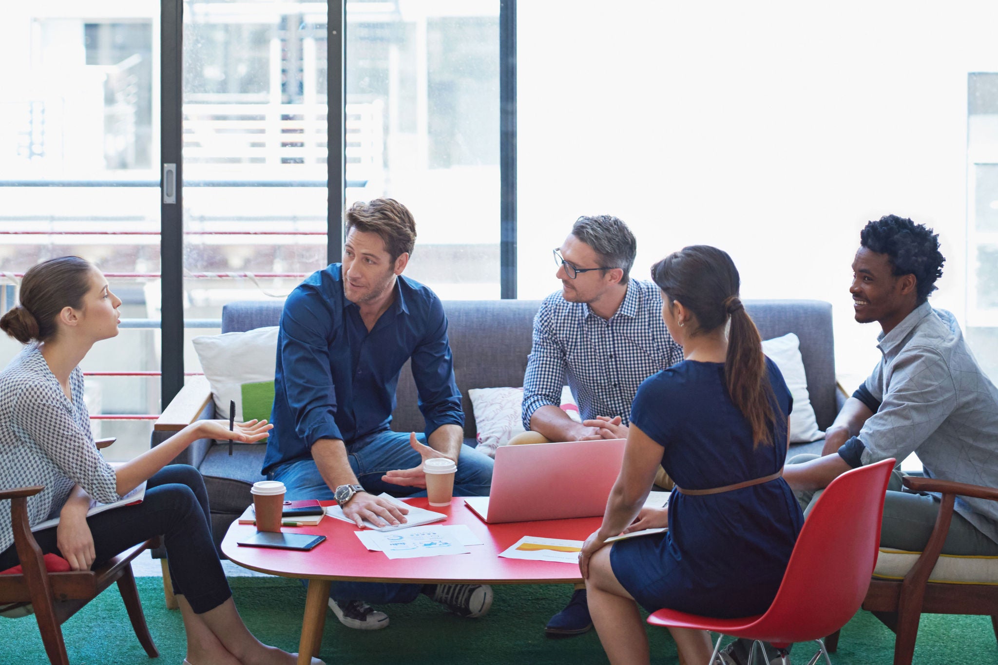 The minds of design. a group of office workers talking together in a meeting room