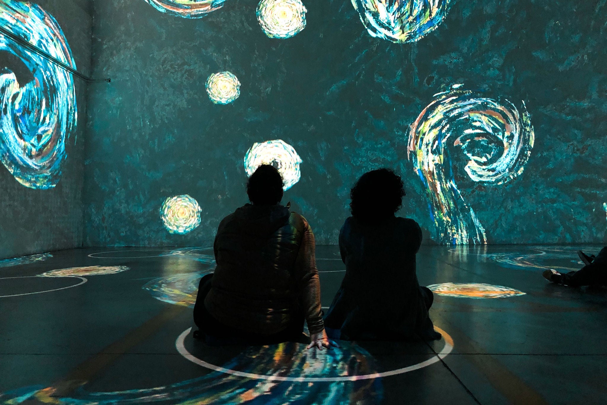 People sitting in physical distancing circles at immersive van gogh exhibit