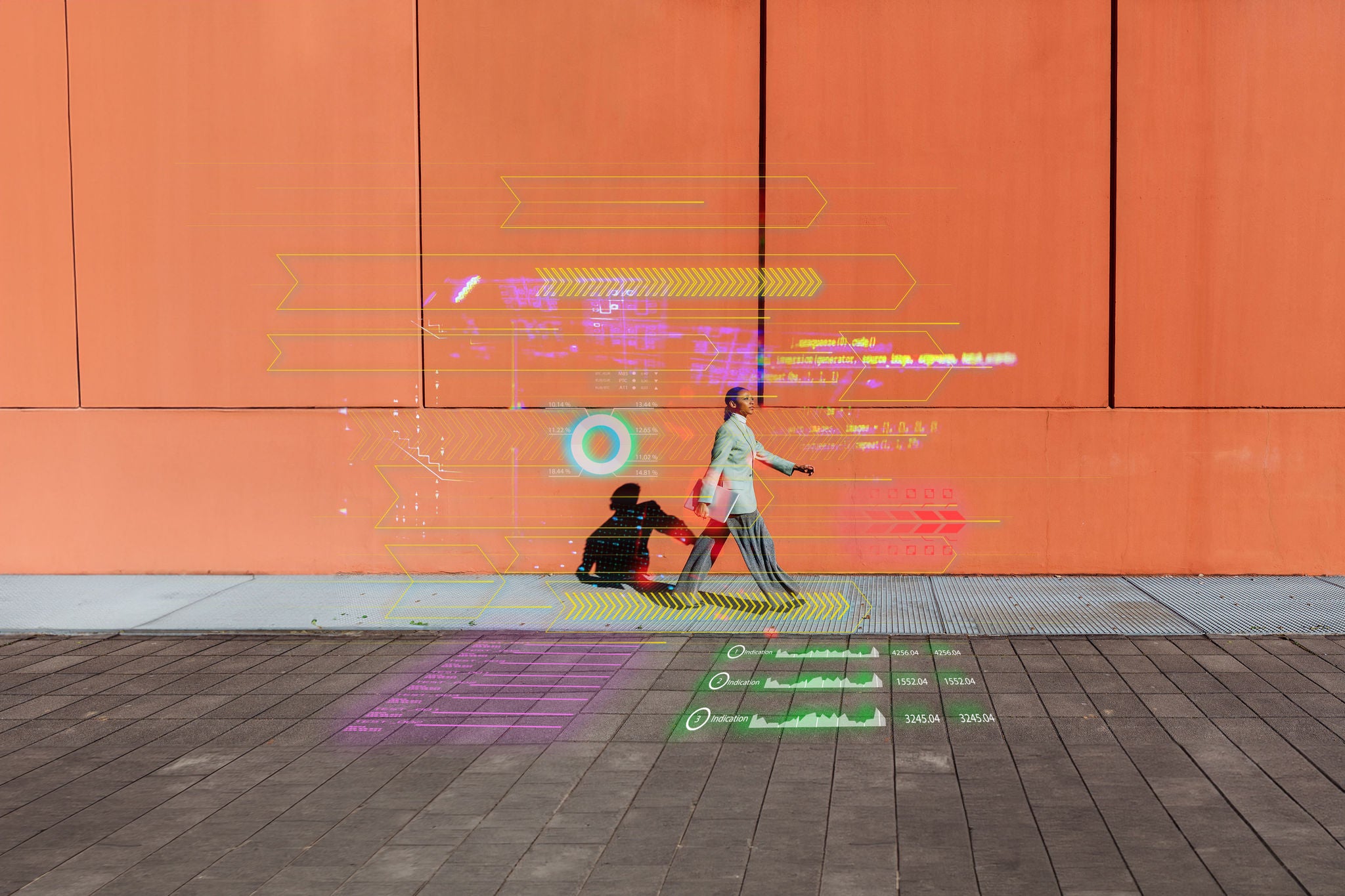 Young businesswoman with laptop walking by orange wall