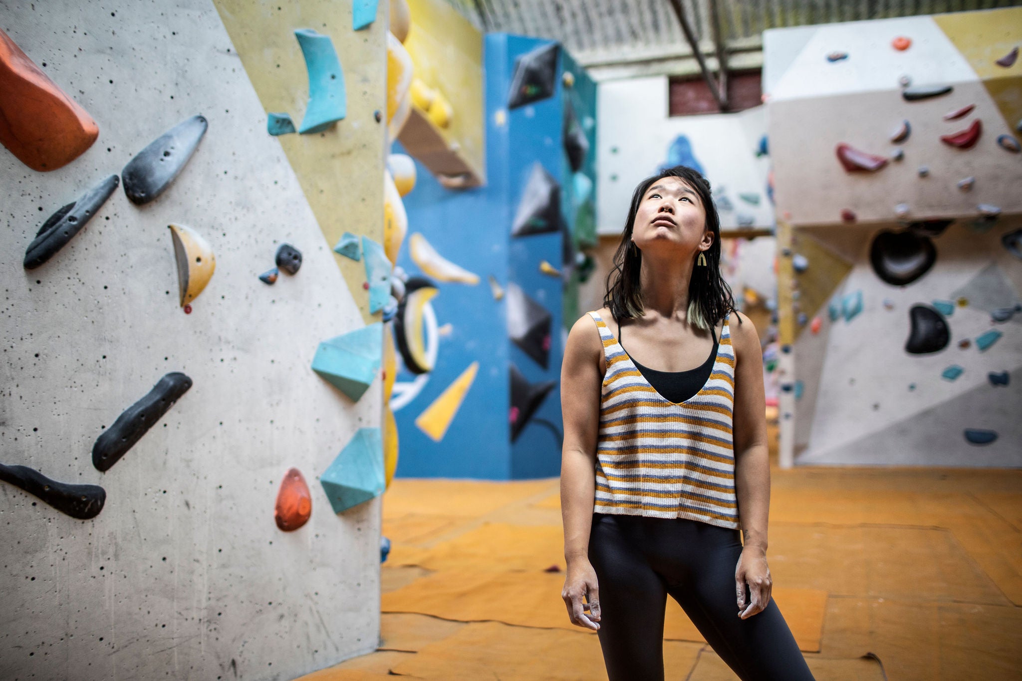 Woman looking up at climbing wall